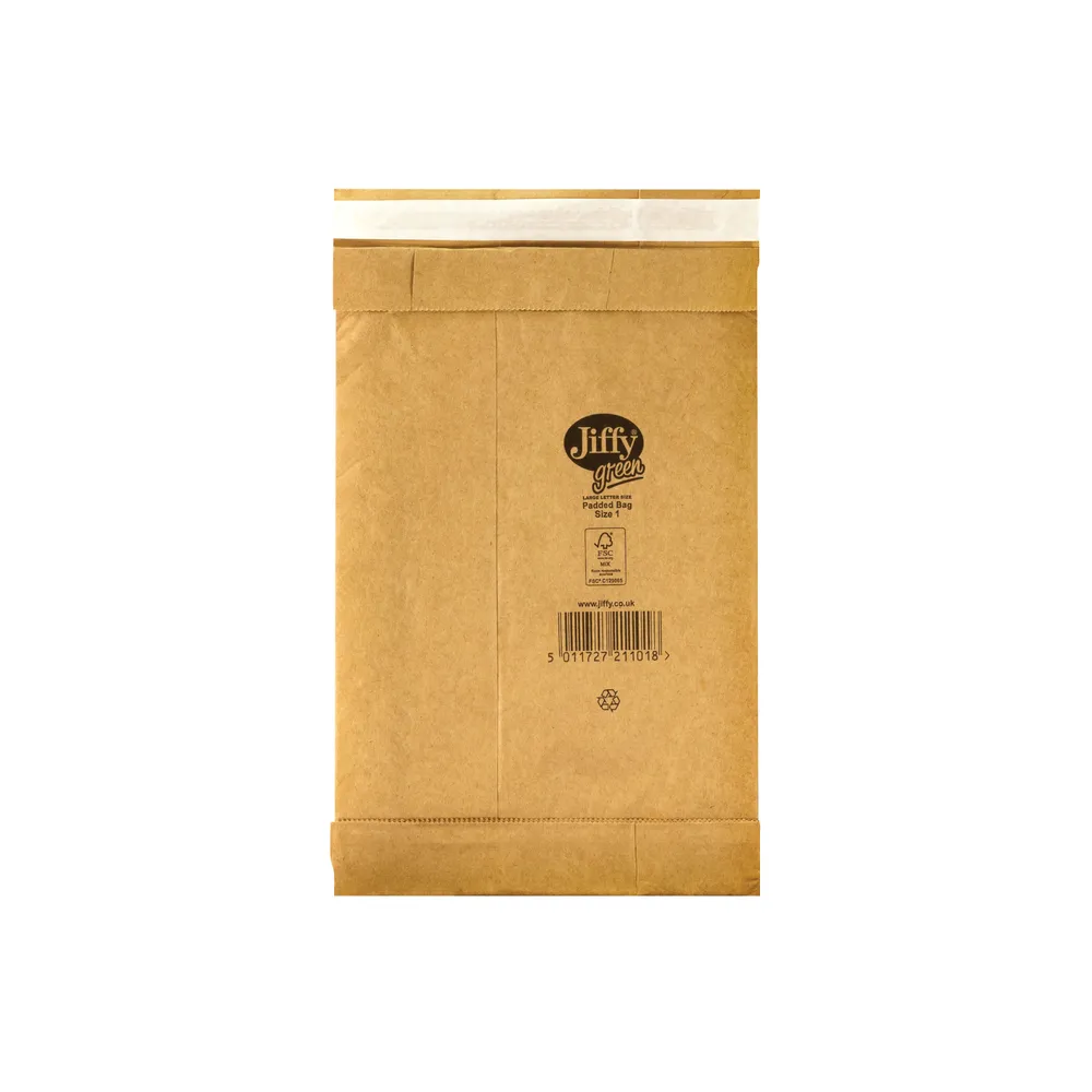 These durable, lightweight Jiffy padded bags feature tough, brown Kraft outer paper with a 100% recycled paper fibre lining. The bags have a doubled glued bottom flap and no side seams for extra protection in transit, and are also 100% recyclable. These size 1 mailers measure 165 x 280mm. This pack contains 100 gold mailers with a self seal closure.